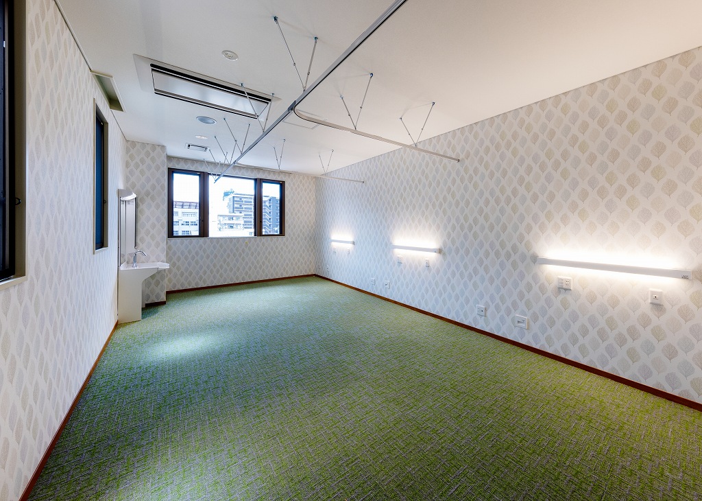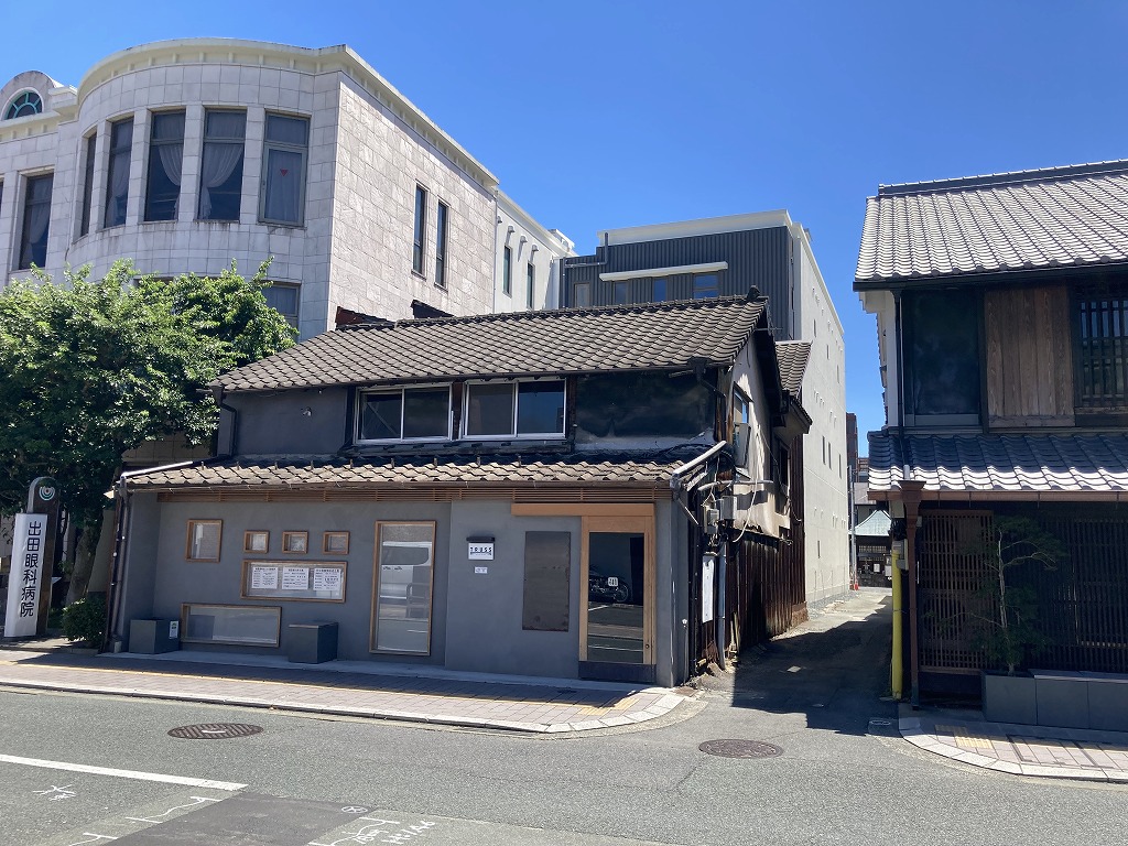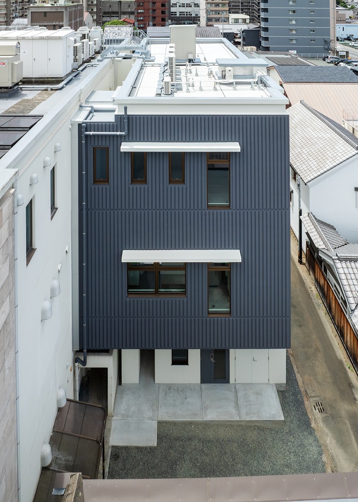 増築部分は将来リノベされる古民家の裏になり、正面道路からは建物上部しか見えません。そこで古民家の背景として馴染むように、外壁は和瓦に近い色を選定し、縦格子をイメージして縦スリットの外観としました。増築規模は決して大きくないのですが、かなり施工が難しい建物でした。