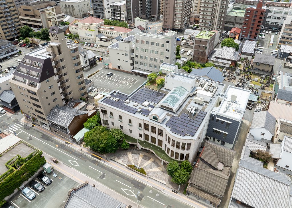 既存建物の西側敷地を病院が取得され、そこに病院を増築するというものです。ただこの計画には条件があり、敷地内の正面道路側に建っている古民家は、この工事完了後にリノベーションして活用するため、取り壊しは不可ということです。そうなると古民家の奥で増築工事を行うには、この敷地西側の細い通路を利用するしかありません。ただこの通路は計画地の奥にあるお寺へ繋がるただ1本通路で、先ほどの保存する古民家と隣地建物に挟まれた通路幅は最小値で約2.5ⅿです。これはトラックでいえば2t車がギリギリ通れる寸法で、大型の建設重機が敷地内で使えない、ということを意味します。そこで杭打機は敷地に搬入可能な最小の重機で計画し、その機種で施工可能な細い鋼管杭を50本打つ設計にしました。また建築資材は施工会社の判断で資材を古民家前からクレーンで吊り上げ、古民家の上空を通して敷地に搬入することにしました。